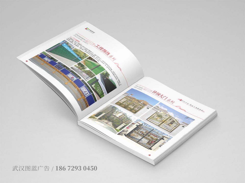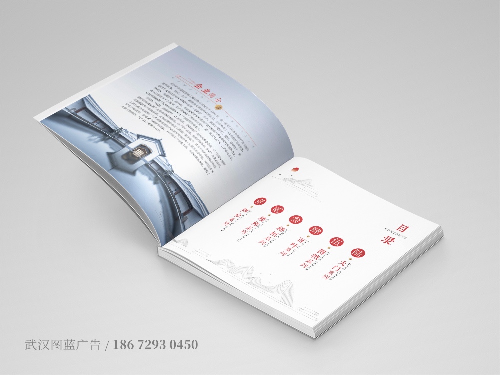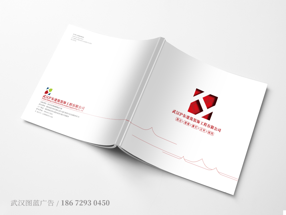 画册封面采用极简的设计手法和新中式的设计风格,以“沪东建筑”LOGO为主要设计元素,将LOGO做镂空设计,放置于画册封面正中间,露出画册扉页的红色图案,合上封面为LOGO与公司全称的组合效果,公司主营产品放置于公司名称下方,封面下方为抽象写意的群山线条,与上方的LOGO组相呼应并延伸至封底,使画册的封面封底连接成一个整体,让画册的封面更加饱满。纯白底色搭配暗红色,不仅设计简洁大气,而且主题突出。画册的内页延续了封面的设计风格,从公司简介、产品优势、主营产品三个版块依次展开介绍,通过此本画册生动形象地将“沪东建筑”公司展现给潜在客户。