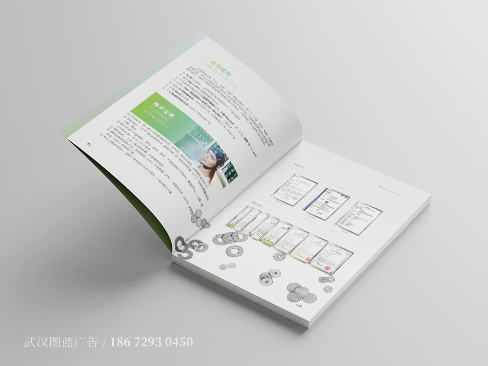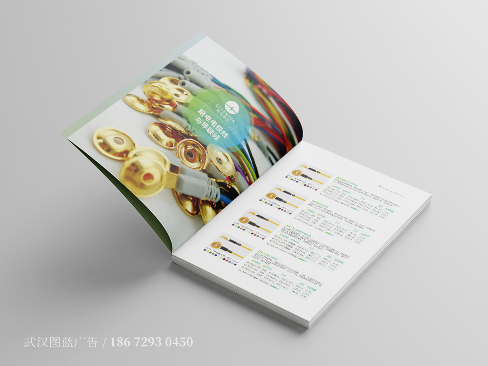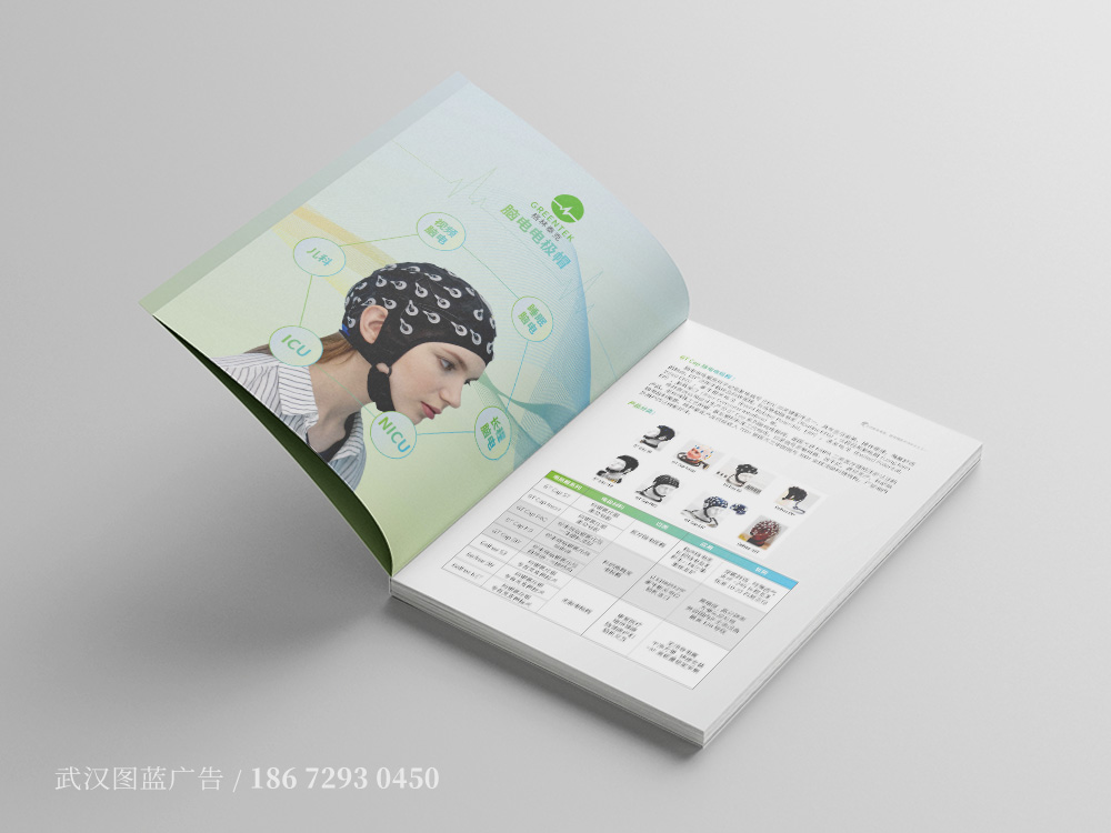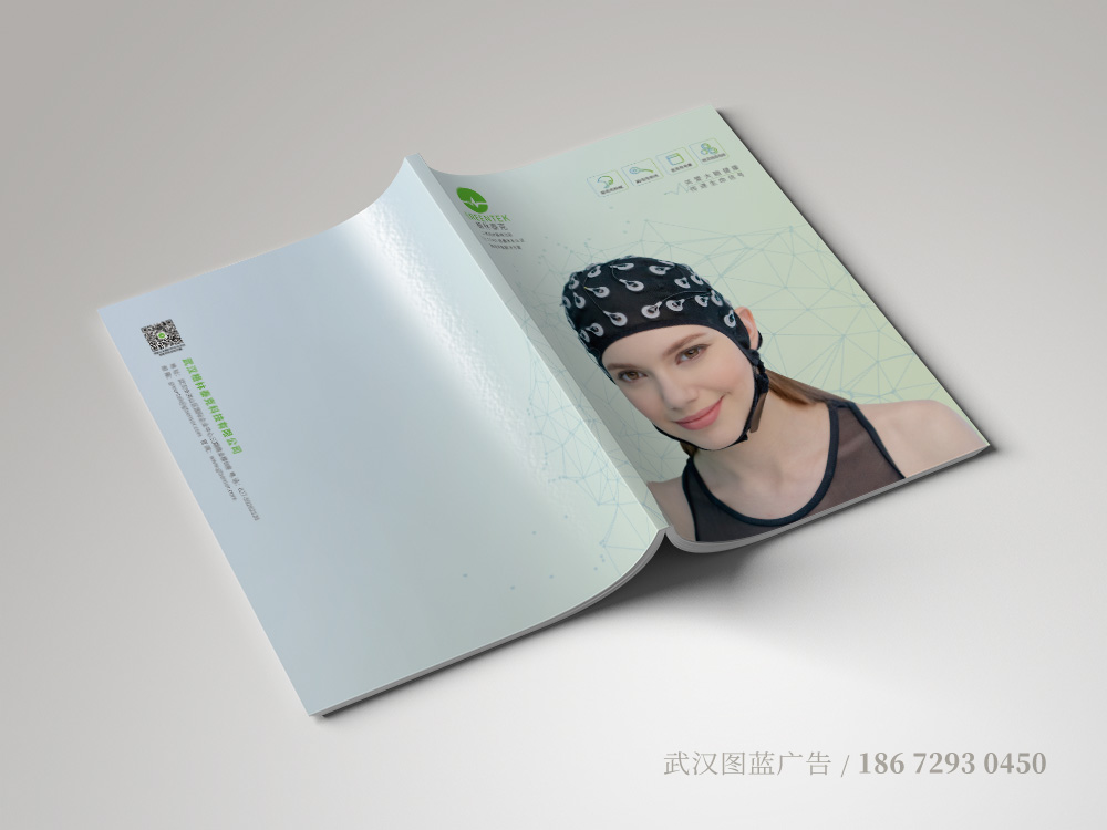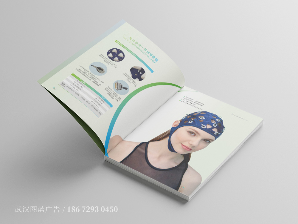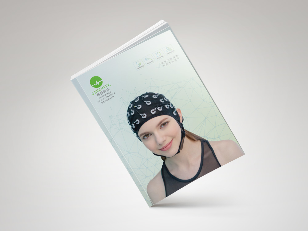 由于此画册定位为纯产品画册,所以画册封面的设计以配戴电极帽产品的模特图片为主要设计元素,象征大脑的抽象线条为底纹,搭配浅色的蓝绿渐变底色,让整个产品样册的封面设计不仅主题突出、符合公司行业特征,而且内容丰富饱满,柔和的色调不仅带给阅读者舒适的体验,更加给人一种温馨的感觉。产品画册的内页设计延续了封面的色调设计风格,以柔和的渐变为底色,让整个画册的版式设计更加饱满,产品大图搭配细节特写图的设计,让产品的展示更加立体生动。